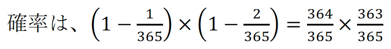 ・1年は365日(うるう年を考慮せず) ・誕生日がどの日になるかの確率は1/365