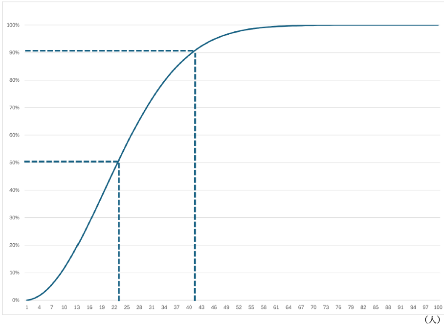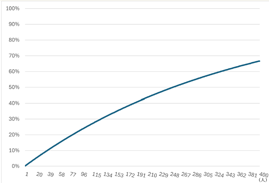 23人を集めれば、そのなかに誕生日が一致する確率が50%を超え、41人を集めれば90%を超えます。